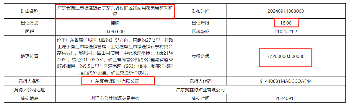 3、廣東省廉江市塘蓬鎮石寧茅頭坑村礦區飾面用花崗巖礦采礦權被廣東聚鑫源礦業有限公司7720萬競得。