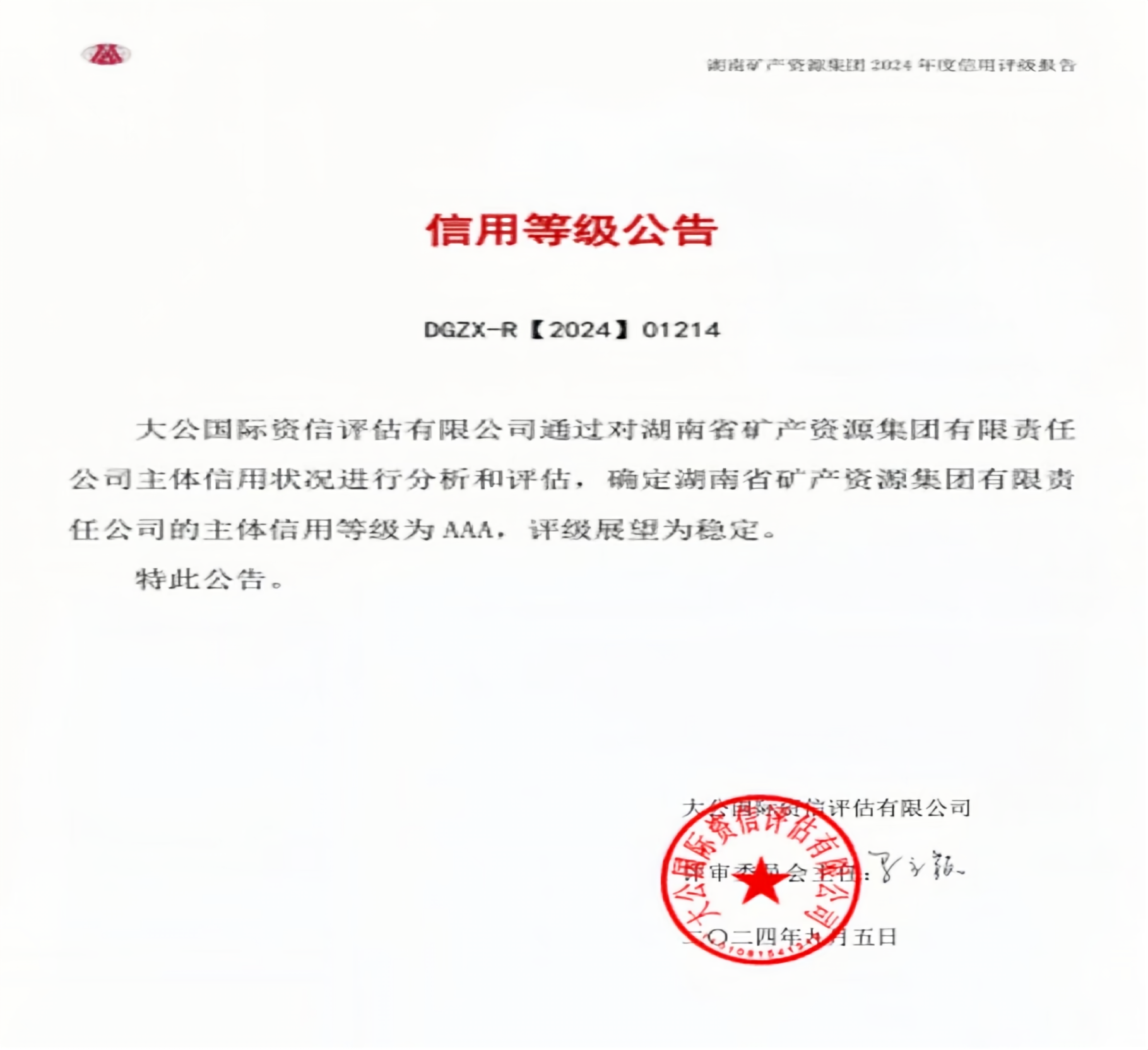 近日,經(jīng)專業(yè)評級機構(gòu)評定,明確湖南省礦產(chǎn)資源集團有限責(zé)任公司主體信用等級為AAA,評級展望為穩(wěn)定。此次評級充分體現(xiàn)了評級機構(gòu)及資本市場對湖南礦產(chǎn)集團行業(yè)地位、經(jīng)營能力及綜合實力的高度認可。