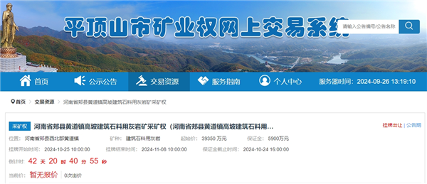 近日,河南省平頂山市礦業權網上交易系統發布郟縣黃道鎮高坡建筑石料用灰巖礦采礦權掛牌出讓公告。該礦資源儲量超1.3億噸,生產規模700萬噸/年,出讓年限17.8年,起始價近4億元,成本約2.97元/噸。