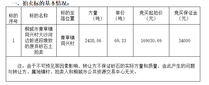據安徽安慶市公共資源交易平臺消息,桐城市一砂石土拍賣項目因開標現場無人參與競價,需重新掛網招標。 該項目標的名稱桐城市青草鎮同興村大沙河邊前進段堆放的廢棄砂石土,拍賣方量2433.06噸,單價69.33元/噸,競拍起始價超16.9萬元。