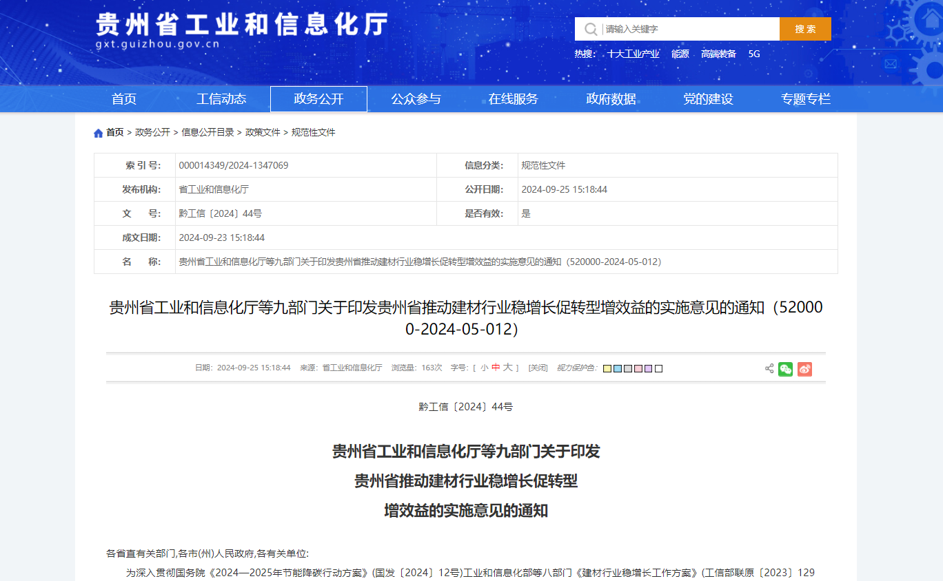 9月23日,貴州省工業和信息化廳等九部門聯合印發《貴州省推動建材行業穩增長促轉型增效益的實施意見》(《意見》)?!兑庖姟分兄赋?,到2025年,建材行業下滑態勢得到有效遏制,規上工業增加值增速止跌回升,力爭實現正增長。建材產品深加工水平和綠色建材占比穩步提高,綠色建材產值占比達到全產業30%。建材行業產業層次、質量效益明顯改善,綠色化、數字化、協同化水平有效提升。