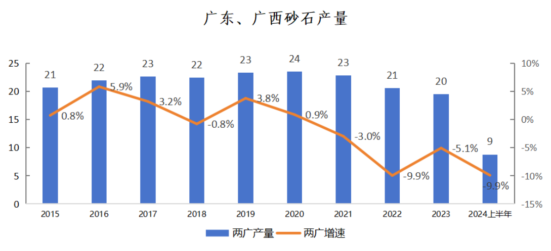 2021年以來,隨著區域內砂石需求減少,砂石產量呈下降趨勢。2023年廣東廣西砂石產量19.5億噸,2024年上半年產量為8.8億噸,同比下降9.9%。