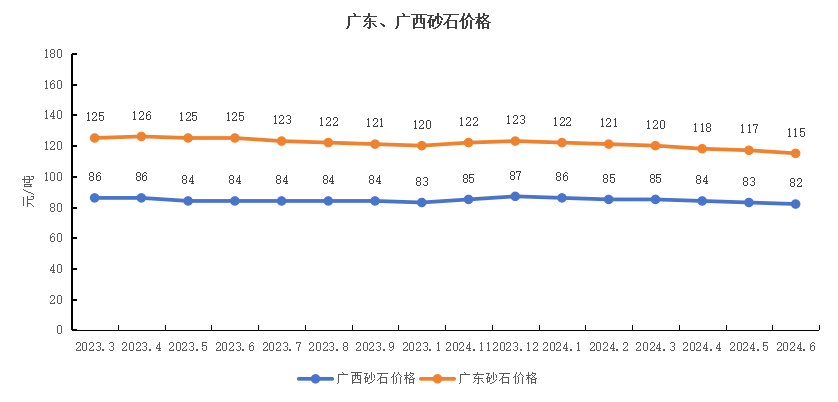 面對目前市場大環境的下行,砂石需求縮小,供應充足,砂石價格也持續下滑。2024年6月,廣東、廣西砂石綜合均價分別為114.6元/噸、81.7元/噸,同比降幅分別為8.1%、2.6%。