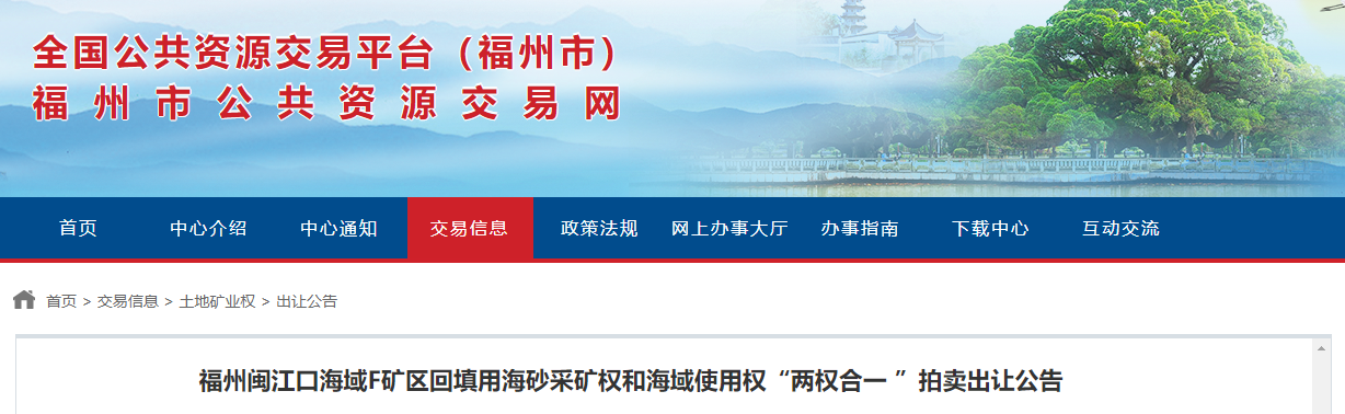 據悉,福建省福州市公共資源交易網發布福州閩江口海域F礦區回填用海砂采礦權和海域使用權“兩權合一 ”拍賣出讓公告,其資源儲量3678.5萬立方米,開采規模1563.36萬立方米/年(設計開采回采率85%),出讓年限2年,起拍價47780.74萬元,約13元/方。