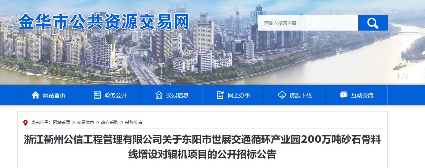 據(jù)悉,浙江東陽(yáng)市世展交通循環(huán)產(chǎn)業(yè)園200萬(wàn)噸砂石骨料線增設(shè)對(duì)輥機(jī)項(xiàng)目進(jìn)行公開(kāi)招標(biāo),歡迎有供貨及服務(wù)能力的供應(yīng)商前來(lái)投標(biāo)。