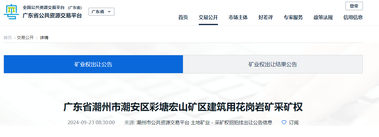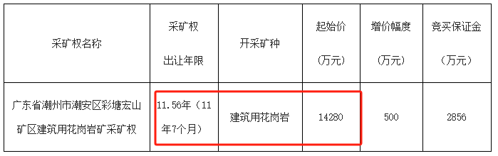 廣東省潮州市潮安區彩塘宏山礦區建筑用花崗巖礦:礦區查明建筑用花崗巖礦石量 2161.66萬立方米,年生產規模120萬方,出讓年限11.56年,掛牌起始價14280萬元。