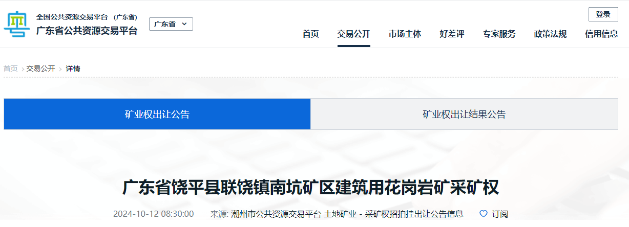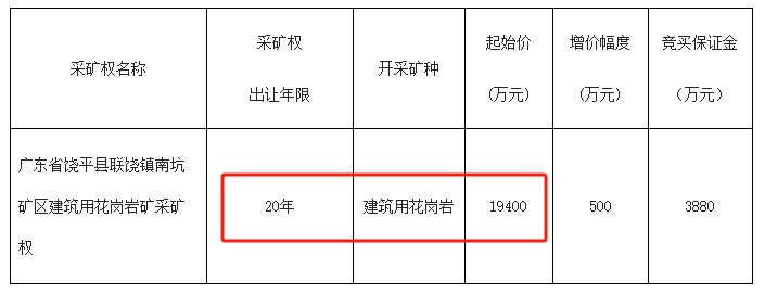 饒平縣聯饒鎮南坑礦區建筑用花崗巖礦采礦權:該礦權擬設礦區范圍內設計可采資源儲量為:建筑用花崗巖2649.92萬立方米,半風化層164.70萬立方米,全風化層238.80萬立方米,殘坡積層及回填土71.70萬立方米。有效期限20年,生產規模為150萬立方米/年,起始價19400萬元。