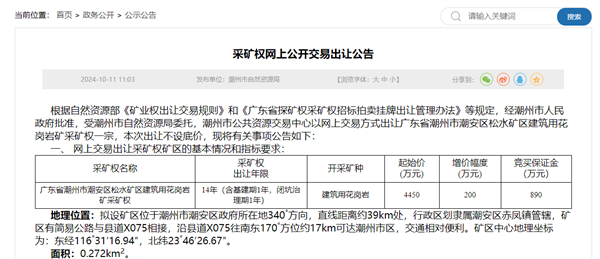 近日,廣東潮州市自然資源局接連掛牌出讓3宗砂石類采礦權。這3宗礦資源儲量約4430萬方,合計年產能240萬方,拍賣時間均在2024年11月。