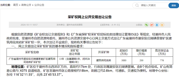 廣東省潮州市潮安區歸湖鎮草堂礦區建筑用花崗巖礦采礦權行政區劃屬潮安區歸湖鎮管轄。擬設礦區范圍內建筑用花崗巖資源量(礦石量)資源量597.31萬方,可采資源礦石量440.39萬方,建設用砂量91.28萬方。生產規模40萬方/年,出讓有效期限13年(含基建期1年,閉坑治理期1年),掛牌起始價3880萬元,折合成本約6.5元/方。