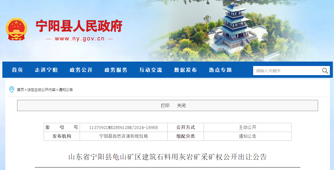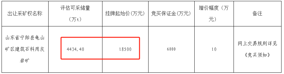 近日,山東泰安市公共資源交易中心寧陽分中心掛牌出讓寧陽縣龜山礦區建筑石料用灰巖礦采礦權,擬設礦區范圍內保有資源量5030.2萬噸,可采儲量4434.4萬噸,采礦回采率98%;生產規模350萬噸/年;擬出讓年限12.67年(不含基建期),18500萬元起拍,單價約3.67元/噸。 礦區位于寧陽縣城區西北約18km,行政區劃隸屬鶴山鎮。報價時間:2024年11月1日8:00-2024年11月14日16:00。