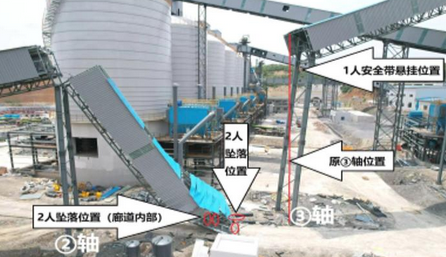 事故發生時,廊道內4名施工人員隨②-③軸段廊道一端墜落:王景樓臉部貼地,安全帽脫離頭部、未佩戴安全帶;封燕鵬臉部朝上,安全帽未脫離頭部,未佩戴安全帶;段旭東臉部貼在廊道走道板上,安全帽脫離頭部,未佩戴安全帶;辛小利坐在廊道內,安全帽外殼脫落,未佩戴安全帶。另一名施工人員李雪因佩戴安全帶,懸掛在③軸立柱處。