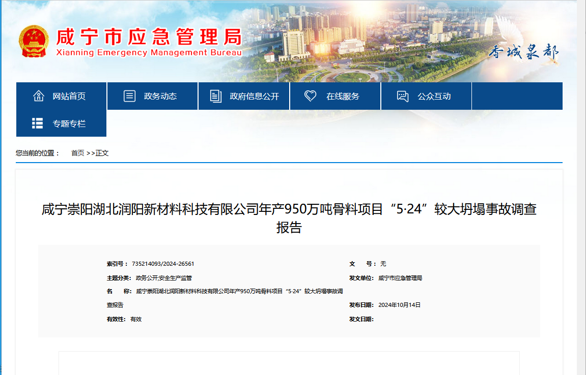 10月14日,咸寧市應急管理局發布《咸寧崇陽湖北潤陽新材料科技有限公司年產950萬噸骨料項目“5·24”較大坍塌事故調查報告》。