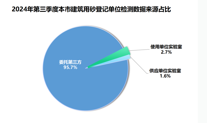 2024年三季度,共有186家供應商開具質(zhì)保書。委托第三方檢測機構(gòu)檢測的178家,占95.7%;使用單位合作實驗室檢測的5家,占2.7%;另外3家,占1.6%,自己是生產(chǎn)單位又是登記供應商,利用自己內(nèi)部實驗室檢測。根據(jù)質(zhì)保書信息,供應上海的建設用砂均為合格。