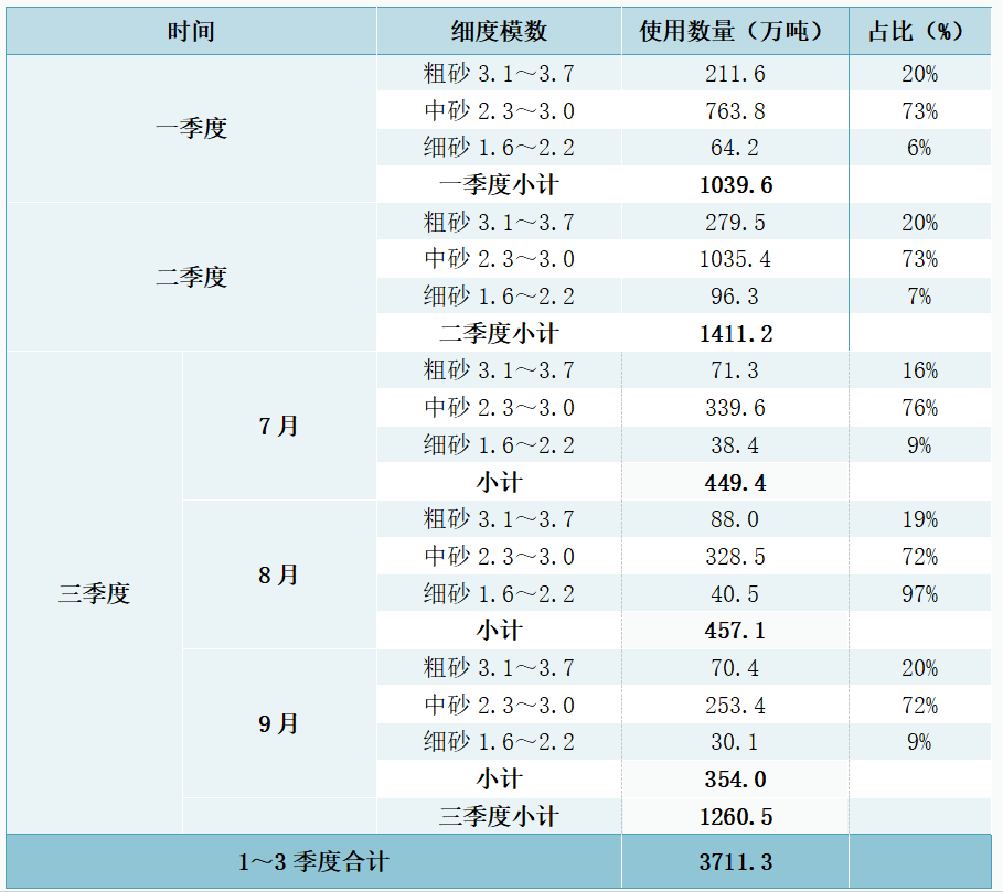 表3:2024年一至三季度本市建設用砂使用粗中細分布情況