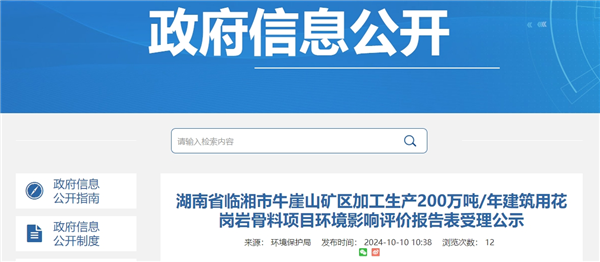 日前,湖南省岳陽市生態(tài)環(huán)境局臨湘分局發(fā)布牛崖山礦區(qū)加工生產(chǎn)200萬噸/年建筑用花崗巖骨料項目環(huán)評受理公示。該項目總投資近1.1億元,主要建設兩條300~400t/h的建筑用花崗巖骨料生產(chǎn)線及其配套輔助設施,施工工期12個月。