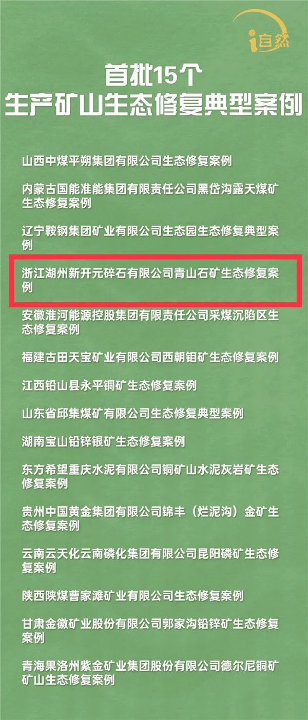 日前,自然資源部在2024中國國際礦業(yè)大會(huì)上發(fā)布了全國首批15個(gè)生產(chǎn)礦山生態(tài)修復(fù)典型案例,湖州新開元碎石有限公司青山石礦生態(tài)修復(fù)項(xiàng)目成為浙江省唯一入選案例。