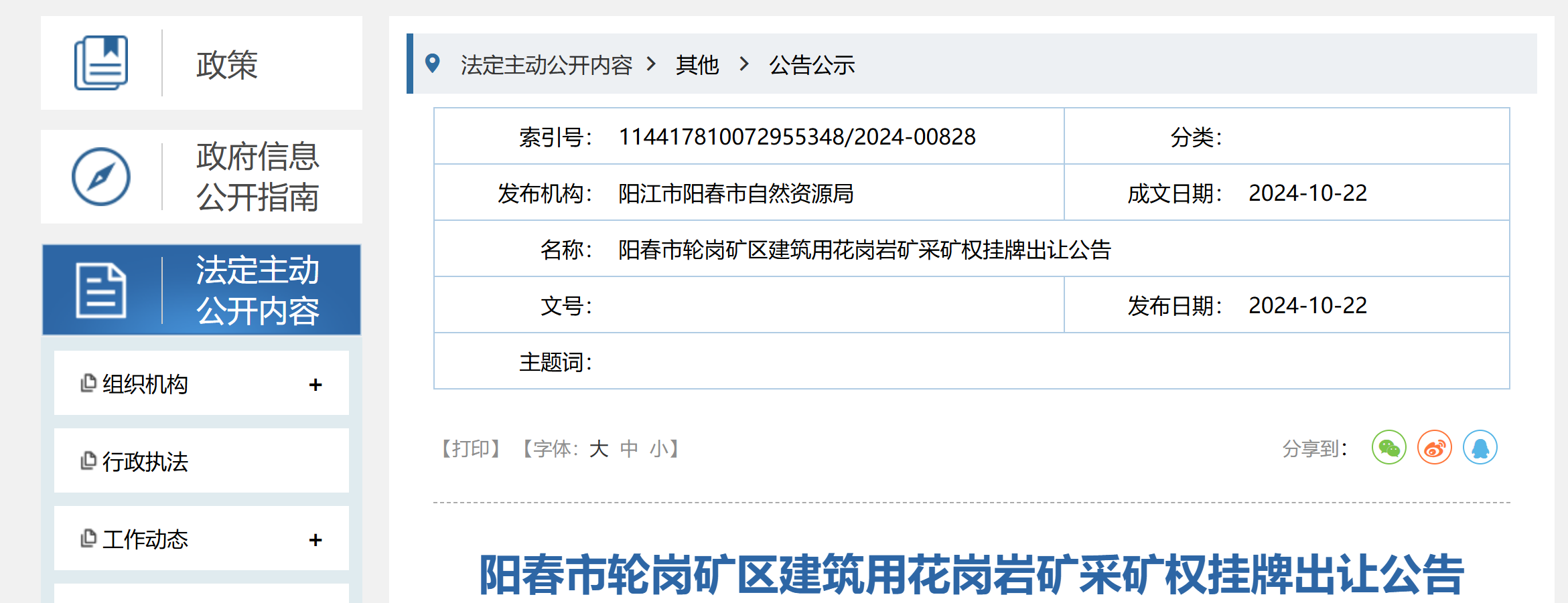 22日廣東省陽春市自然資源局發布陽春市輪崗礦區建筑用花崗巖礦采礦權掛牌出讓公告,該礦權資源儲量約4億方,設計生產規模1200萬方/年,擬出讓年限28年,掛牌起始價20億元,還另需支付其它費用超22億元。