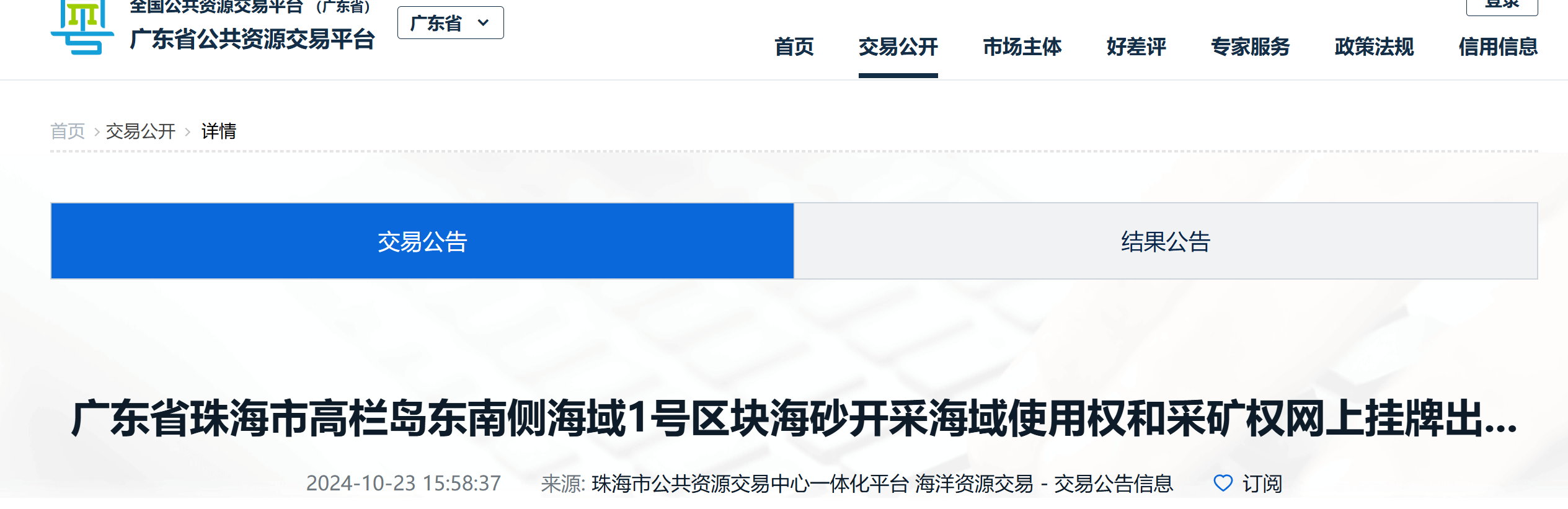 23日廣東省珠海市海洋發展局發布了廣東省珠海市高欄島東南側海域1號區塊海砂開采海域使用權和采礦權網上掛牌出讓公告。海砂原礦資源儲量7174.39萬立方米,生產規模2100萬立方米/年,出讓年限3年,掛牌起始價為人民幣273596.63萬元。