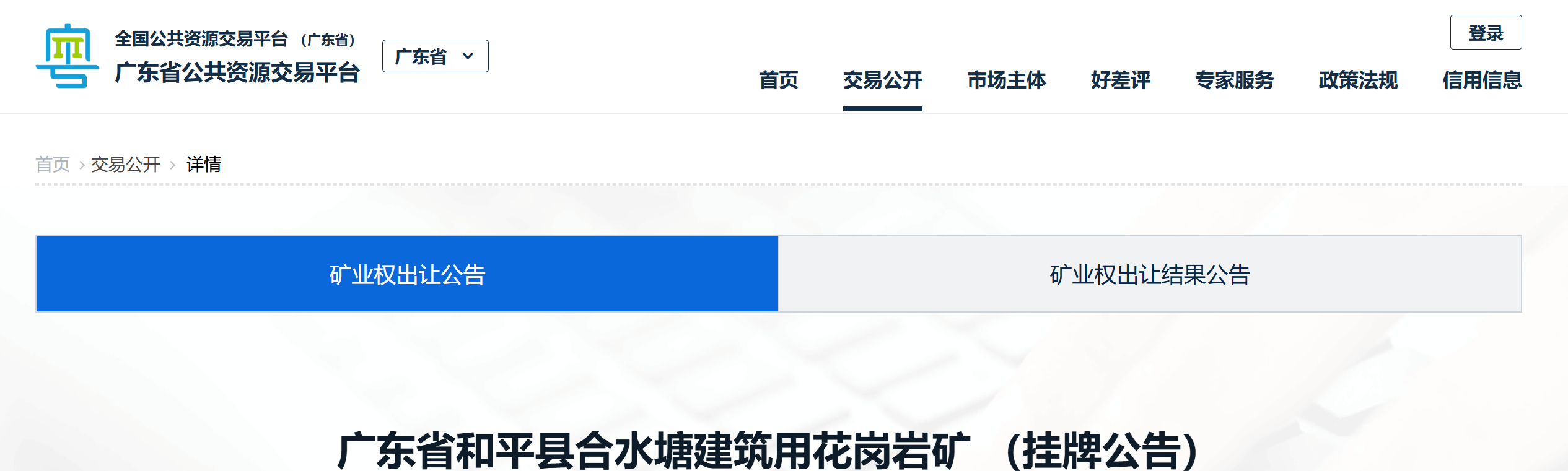 23日廣東省公共資源交易平臺發布廣東省和平縣合水塘建筑用花崗巖礦,該礦權資源量礦石量1084.78萬立方米,設計開采規模50萬立方米/年,出讓年限17年。掛牌起始價4325.27萬元。