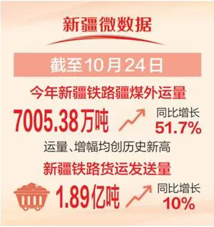 今年截至10月24日,新疆鐵路疆煤外運量達7005.38萬噸,同比增長51.7%,運量、增幅均創歷史新高。