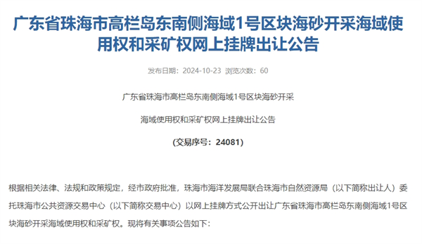 本次海砂開采海域使用權和采礦權掛牌出讓不設底價,按照價高者得的原則確定競得人。掛牌起始價為人民幣27.36億元(其中海域使用金11.54億元,采礦權出讓收益15.82億元)