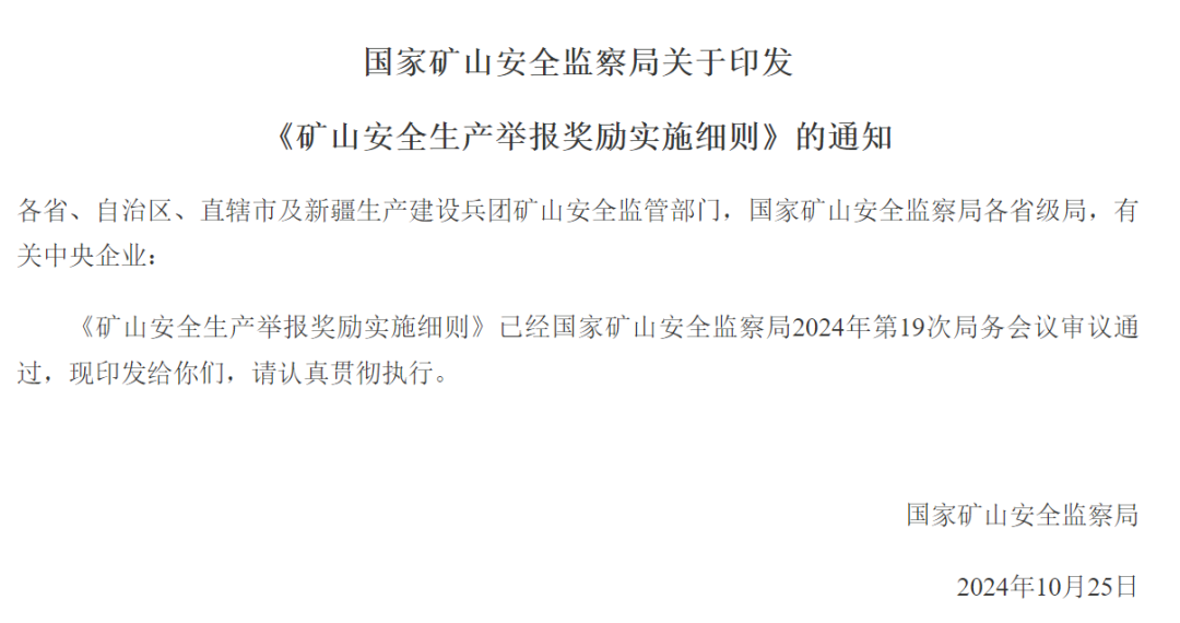 10月29日,國家礦山安全監察局印發《礦山安全生產舉報獎勵實施細則》,其中提到進一步加強對礦山安全生產工作的社會監督,鼓勵舉報礦山重大事故隱患和安全生產違法行為,及時發現并消除礦山重大事故隱患,制止和懲處礦山違法行為,依據相關文件要求,制定本實施細則。