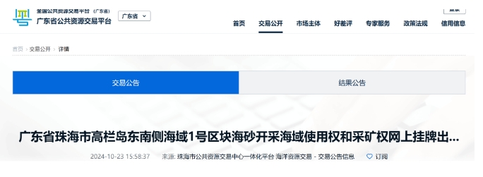 珠海市高欄島東南側海域1號區塊海砂開采海域使用權和采礦權:海砂原礦資源儲量7174.39萬方,生產規模2100萬方/年,出讓年限3年,掛牌起始價27.36億元。