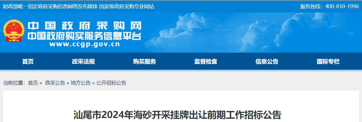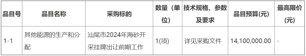近日,汕尾市發布2024年海砂開采掛牌出讓前期工作招標公告,項目采購包預算金額1410萬元,