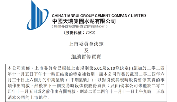 11月5日為最后期限!天瑞水泥面臨退市風(fēng)險(xiǎn)