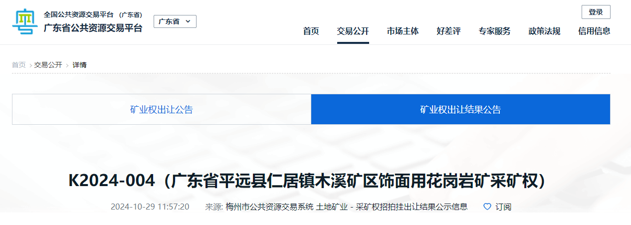 近日,廣東省平遠縣仁居鎮木溪礦區飾面用花崗巖礦被廣東建藝石材有限公司以19242.52萬元拍得。采礦權范圍內累計查明飾面用花崗巖礦石資源量4059.02萬立方米,可采建筑用花崗巖資源儲量2671.46萬方,生產規模110萬立方米/年,其中,建筑用花崗巖80萬立方米/年。擬出讓年限33.3年。