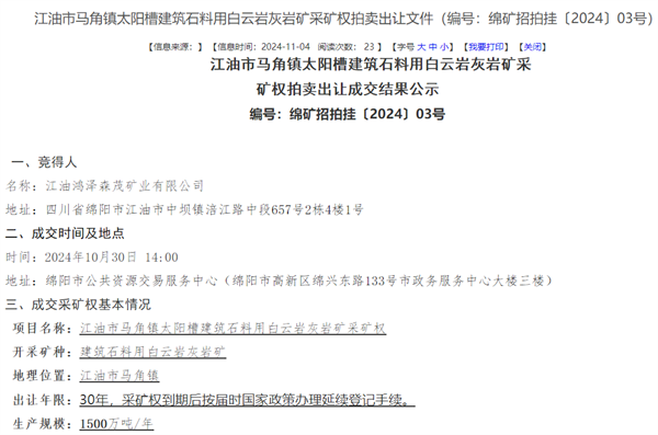 · 底價(jià)成交!四川國(guó)企競(jìng)得儲(chǔ)量5.3億噸、1500萬噸/年砂石大礦... (2024-11-05)