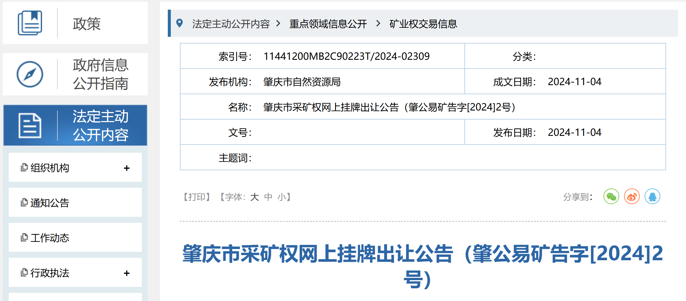廣東省肇慶市高要區活道鎮塘茍礦區建筑用花崗巖礦采礦權掛牌出讓公告