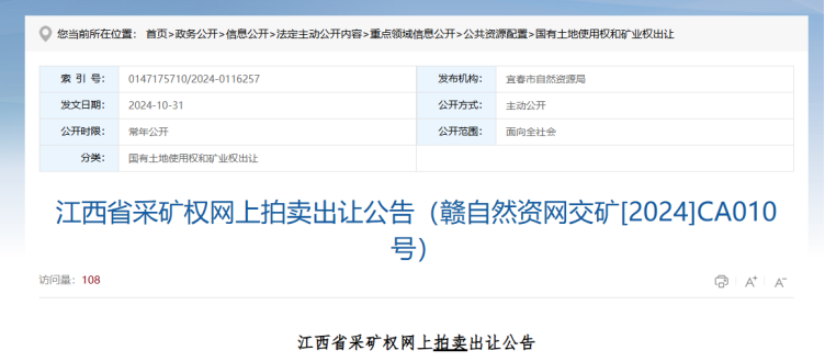 日前,江西省宜春市自然資源局發布奉新縣梧崗礦區建筑用花崗巖石料礦采礦權拍賣出讓公告。該項目保有資源儲量約1.05億噸,生產規模為建筑用石料500萬噸/年、瓷土18.76萬噸/年,擬出讓年限21年(含1年基建期),掛牌起始價約1.66億元,起拍成本約1.58元/噸,2024年11月28日10時起拍。