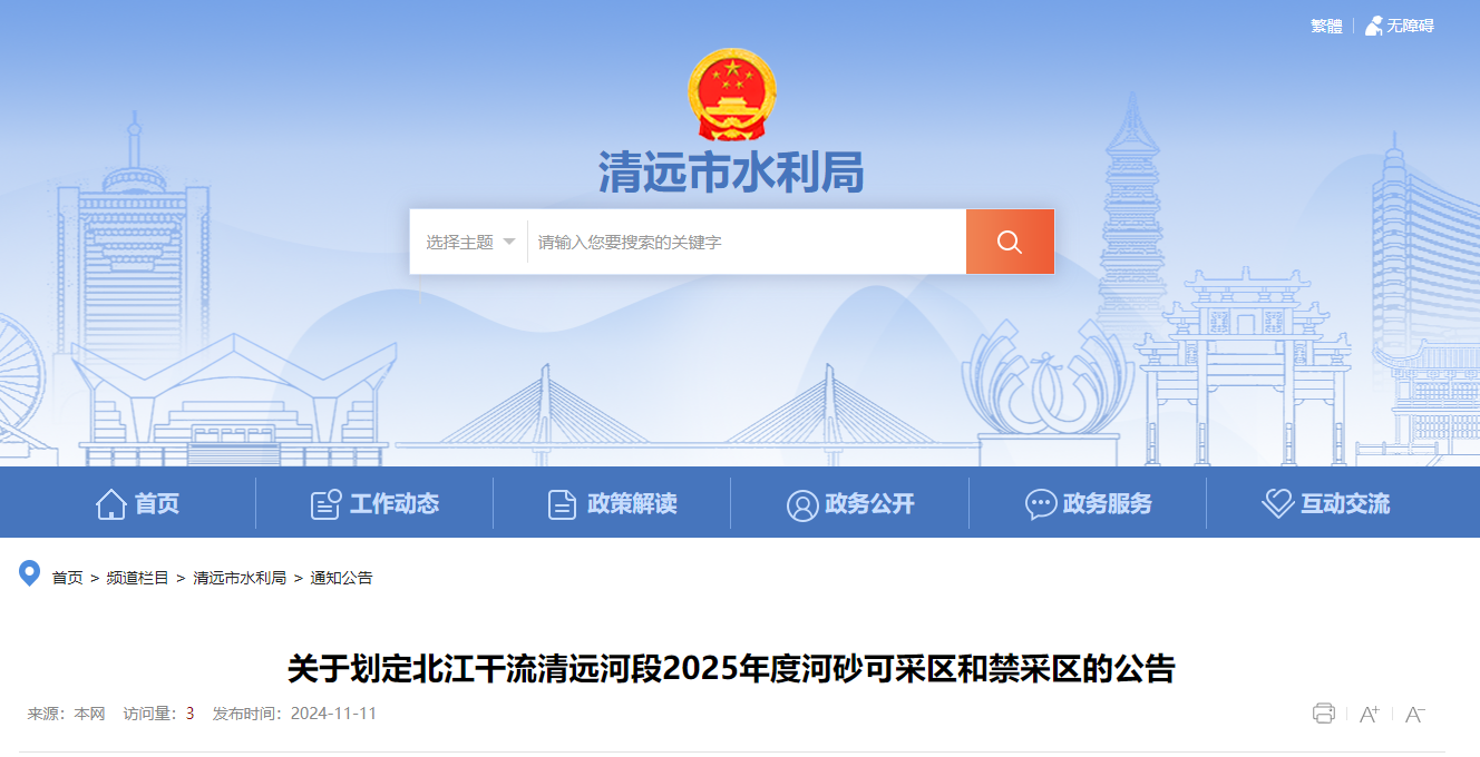 近日,廣東清遠市水利局發布關于劃定北江干流清遠河段2025年度河砂可采區和禁采區公告。公告表示,目前北江干流清遠河段2024年度經省水利廳批準但未開采完成的河砂可采區共1個,為英德市湖溪可采區;2025年度經省水利廳批準可采區共2個,為英德市連江口西二村至沙頭采區和連江口沙頭至小樟采區。北江干流清遠河段全長共165.1km,年控制采砂總量237萬方。