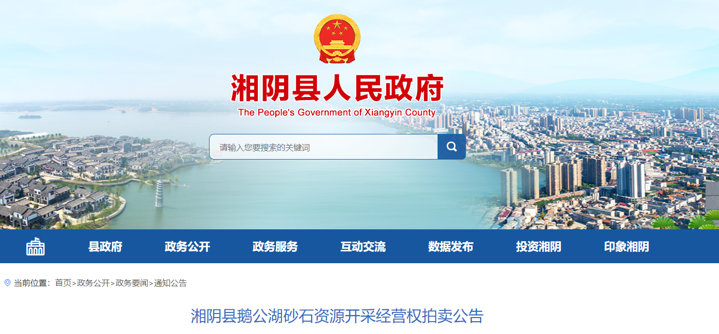 近日,湖南省岳陽市昌廉拍賣有限公司受湘陰縣水利局委托擬拍賣湘陰縣鵝公湖砂石資源開采經營權,開采期限為3年,起拍價為39882.23萬元 。