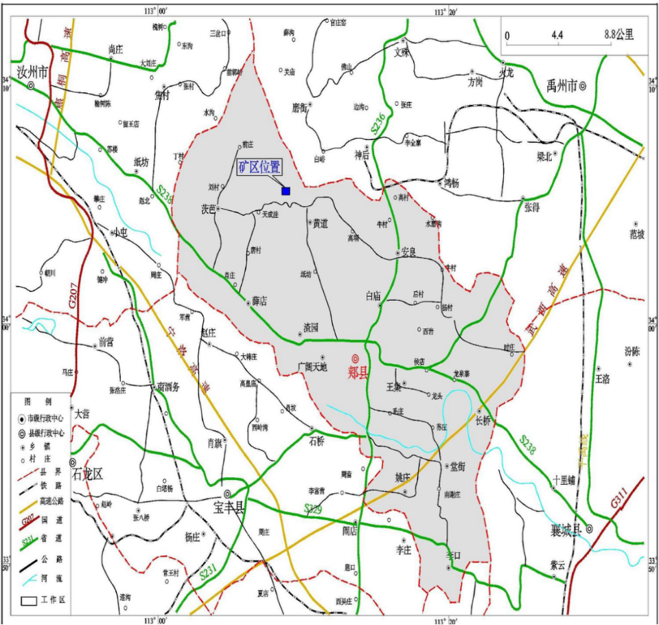 據了解,該礦區位于郟縣西北部,郟縣縣城至黃道鎮由郟縣—景家洼公路(縣級公路)相連通,黃道鎮與高坡村有“村村通”公路相連,高坡村與擬設礦區有簡易公路連通。由擬設礦區沿鄉道向東南行駛5km可至黃道鎮,沿縣道向南行駛10km左右可達郟縣縣城;向東沿鄉道行駛10km左右可接省道S326,繼續向東10km左右可達武西高速公路;由擬設礦區向西南6km左右可接省道S328,繼續向西南10km左右可達寧洛高速公路。礦區交通條件較為便利。