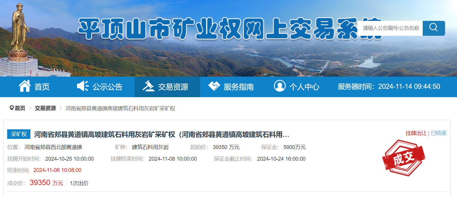 近日,河南省郟縣黃道鎮高坡建筑石料用灰巖礦采礦權成功出讓。該建筑石料用灰巖礦資源儲量13249.49萬噸,設計生產規模700萬噸/年,出讓年限17.8年,郟縣吉華建材有限公司以底價39350萬元競得,單價約2.97元/噸。
