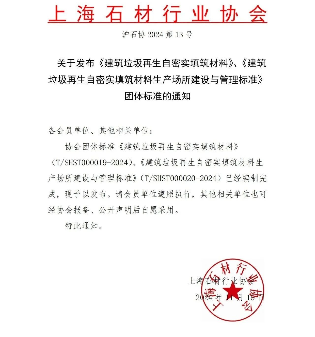 日前,上海市石材行業(yè)協(xié)會發(fā)布《建筑垃圾再生自密實填筑材料》、《建筑垃圾再生自密實填筑材料生產場所建設與管理標準》團體標準。