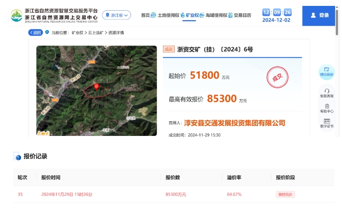 今日(12月2日),浙江省淳安縣文昌鎮西河村建筑用砂巖礦經35輪報價,被當地國企淳安縣交通發展投資集團有限公司以8.53億元競得,溢價率64.67%。該礦權出讓資源量5142.8萬噸,出讓期限16年,年生產規模350萬噸,經計算,該項目噸成本超16元。