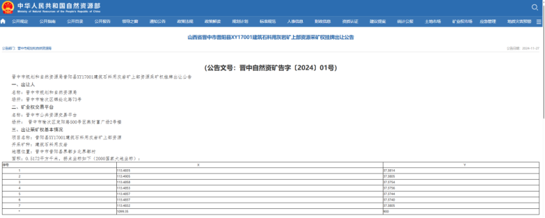 據悉,該項目礦區位于山西省晉中市昔陽縣界都鄉北界都村,礦區面積0.5172平方千米,開采礦種為建筑石料用灰巖,掛牌時間為2024年12月27日至2025年1月13日。
