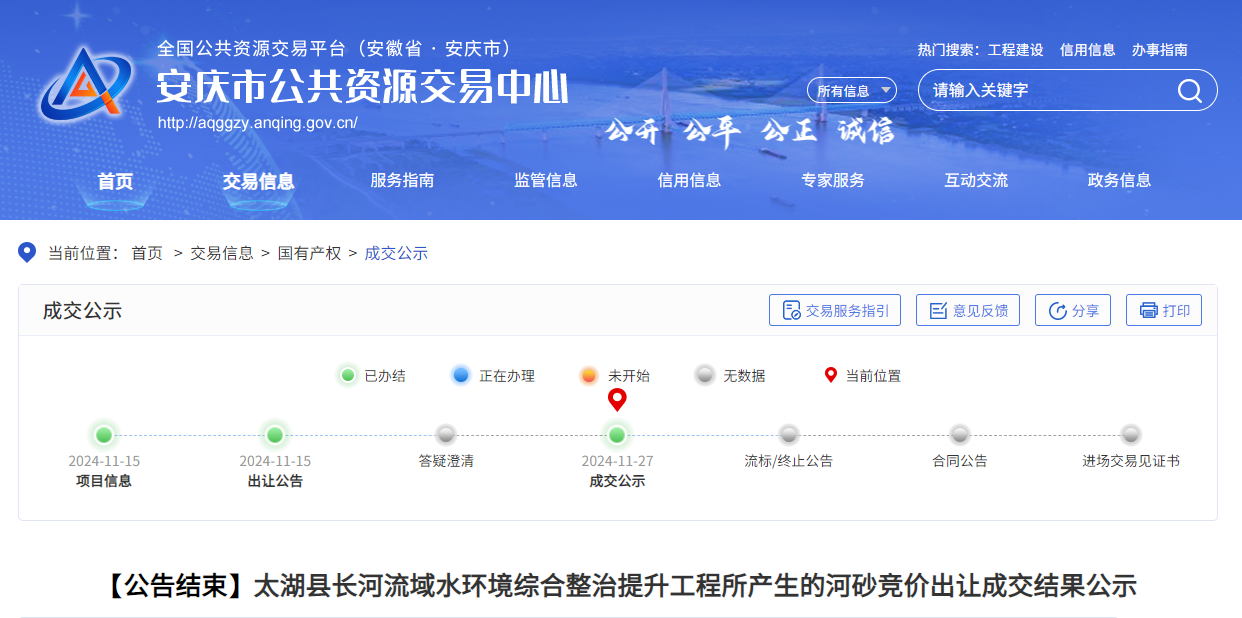據悉,安徽安慶太湖縣長河流域水環境綜合整治提升工程所產生的河砂被太湖縣和美農業發展有限公司以近4億元成功拍賣,總河砂量約為540.04萬立方米(874.86萬噸)。