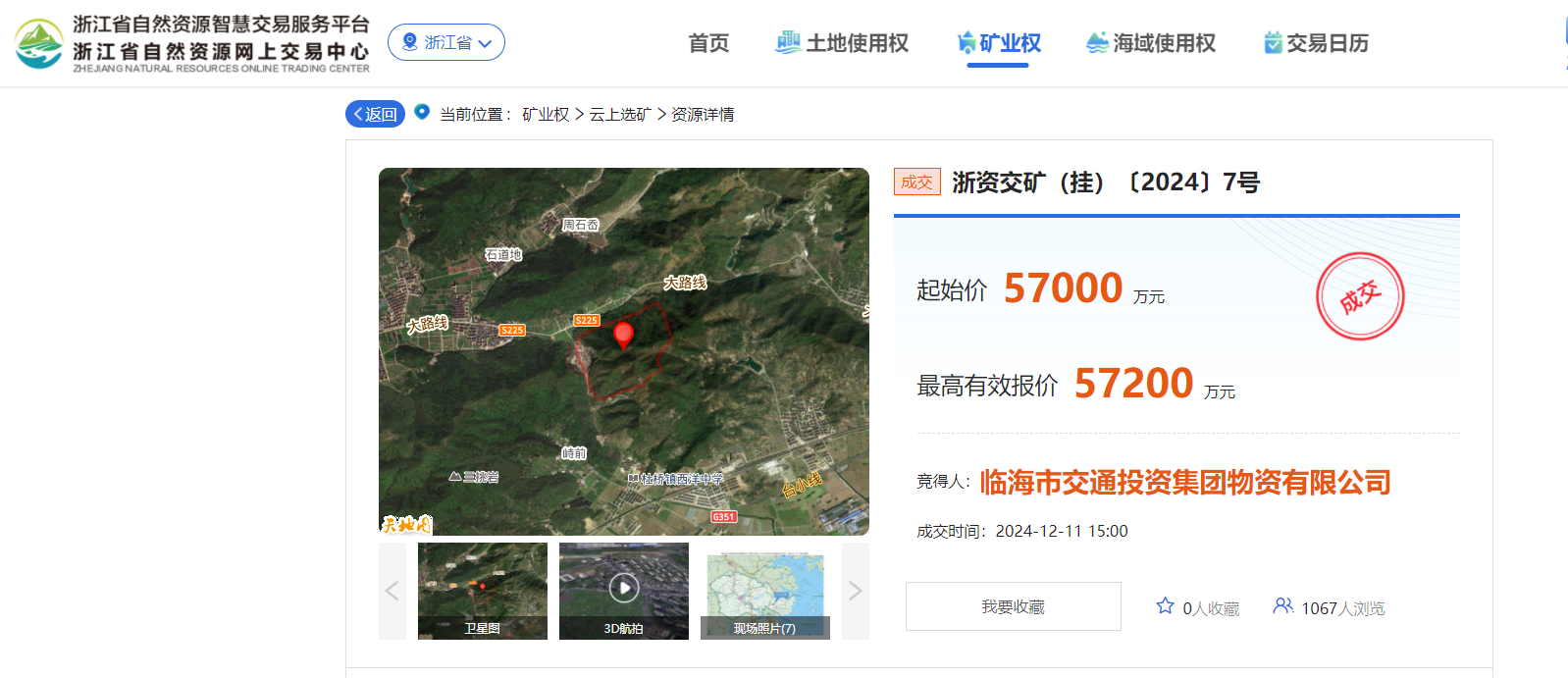 12月11日,浙江省象山縣涂茨鎮錢倉村建筑用石料(凝灰巖)礦被臨海市交通投資集團物資有限公司以5.72億元拍得。礦區控制資源量4531.628萬噸,宕渣278.447萬噸,殘破基層剝離量67.216萬立方米。出讓期限5年,生產規模980萬噸/年。
