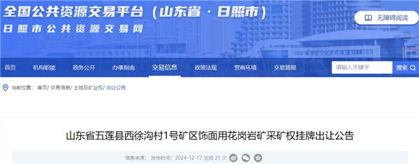 12月17日,山東省日照市公共資源交易網發布五蓮縣西徐溝村1號礦區飾面用花崗巖礦掛牌出讓公告。該礦可采礦石量7018.35萬方,開采規模145萬方/年,起始價近8億元。掛牌時間為2025年1月15日至2025年2月5日。