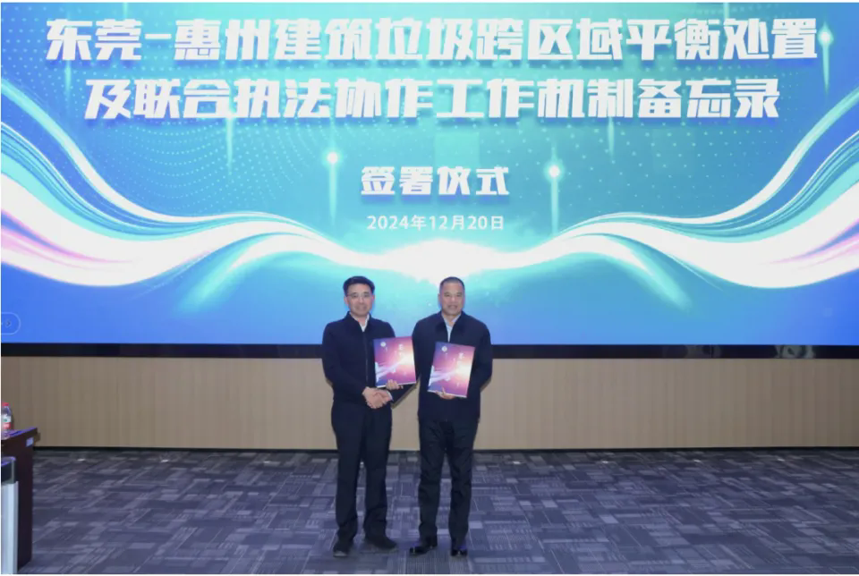 12月20日,東莞市城市管理和綜合執(zhí)法局、惠州市城鄉(xiāng)管理和綜合執(zhí)法局在東莞數(shù)字城管指揮中心共同簽署《東莞、惠州建筑垃圾跨區(qū)域平衡處置及聯(lián)合執(zhí)法協(xié)作工作機(jī)制備忘錄》(以下簡稱“備忘錄”),堅(jiān)持“區(qū)域協(xié)同共治、全過程治理、全鏈條打擊”原則,推動形成聯(lián)合監(jiān)管、嚴(yán)管重罰的高壓態(tài)勢,對建筑垃圾跨市域偷運(yùn)和傾倒、違法運(yùn)輸處置等問題標(biāo)本兼治。東莞市城市管理和綜合執(zhí)法局副局長陳世光、惠州市城鄉(xiāng)管理和綜合執(zhí)法局副局長陳海濤出席會議。