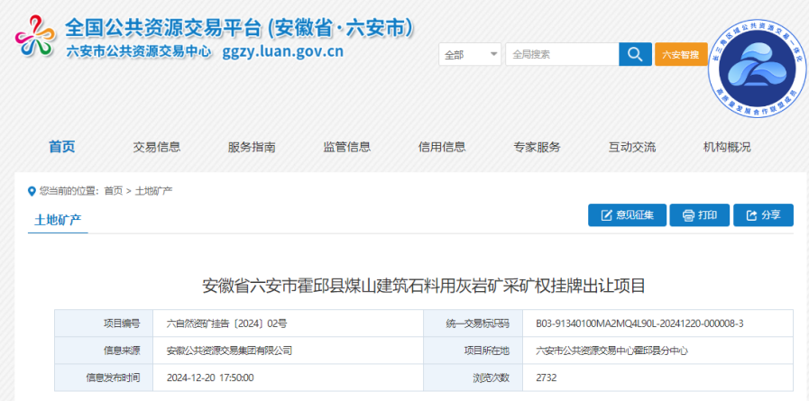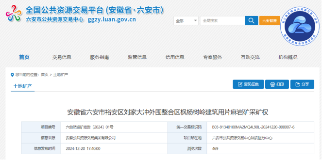 12月20日,安徽發布2宗砂石類采礦權出讓公告。據悉,這2宗礦均位于安徽省六安市,合計儲量約1.32億噸,合計年產能約980萬噸。報名起止時間均為2024年12月23日9時至2025年1月20日9時。