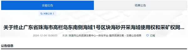 12月4日,珠海市高欄島東南側海域1號區塊海砂開采海域使用權和采礦權終止出讓。該項目可采資源量5598.74萬方,生產規模2100萬方/年,出讓年限3年,掛牌起始價約27.36億元,成本約48.87元/方。