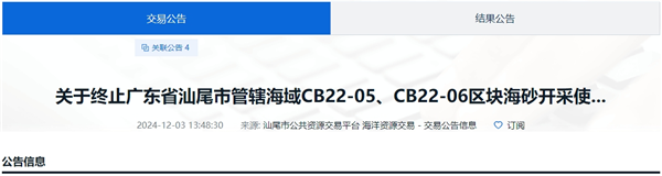 12月3日,汕尾市管轄海域CB22-05、CB22-06區塊海砂開采海域使用權和采礦權終止出讓。CB22-05、CB22-06區塊海砂資源儲量共超5000萬方,出讓年限3年,起始價約11.87億元,起拍單價23.75元/方。