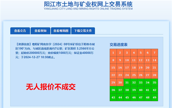 12月27日,廣東省陽江市陽春市輪崗礦區建筑用花崗巖礦采礦權因無人報價而流拍。該項目資源儲量約4億方,設計生產規模1200萬方/年,擬出讓年限28年,掛牌起始價為20億元,還需支付額外費用22.22億元。