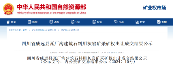 近日,四川省內江市自然資源和規劃局正式發布了四川省威遠縣瓦廠溝建筑石料用灰巖礦采礦權出讓的成交結果公示,這一消息在當地礦業領域引發了廣泛關注。最終,四川晨宇礦業有限公司在激烈的競爭中脫穎而出,成功競得該采礦權項目。