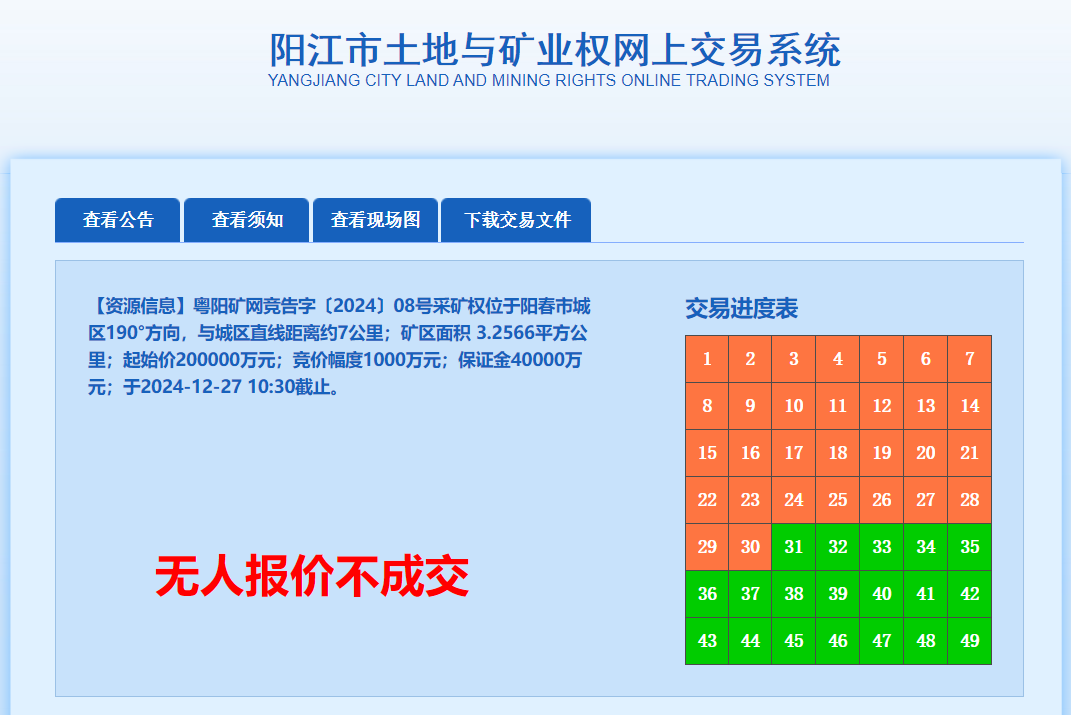 該礦權已經是第三次流拍了 2023年11月 該項目首次掛牌出讓 歷經2次延遲 最終還是流拍 2024年2月 該項目第二次發布出讓公告 但是在正式掛牌前一天 突然發布終止出讓公告 2024年10月22日 該項目發布第3次出讓公告 并降低6億的額外支付費用 歷經多次延遲 依舊無人報名